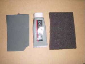 では道具を用意しましょ。左からサンドペーパー(600番以上できれば1000番ぐらいがよい)コンパウンド(極細目)スポンジ、ウエスetc。